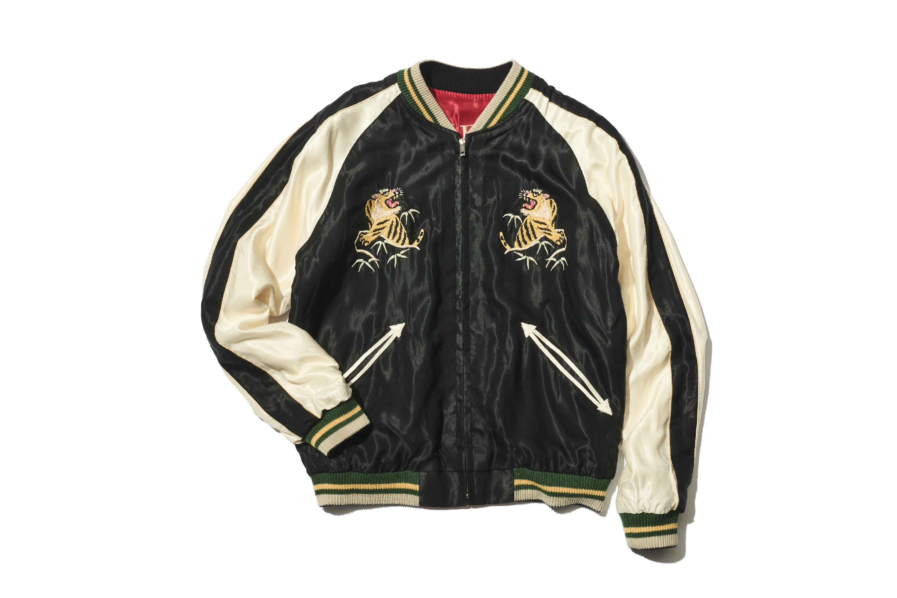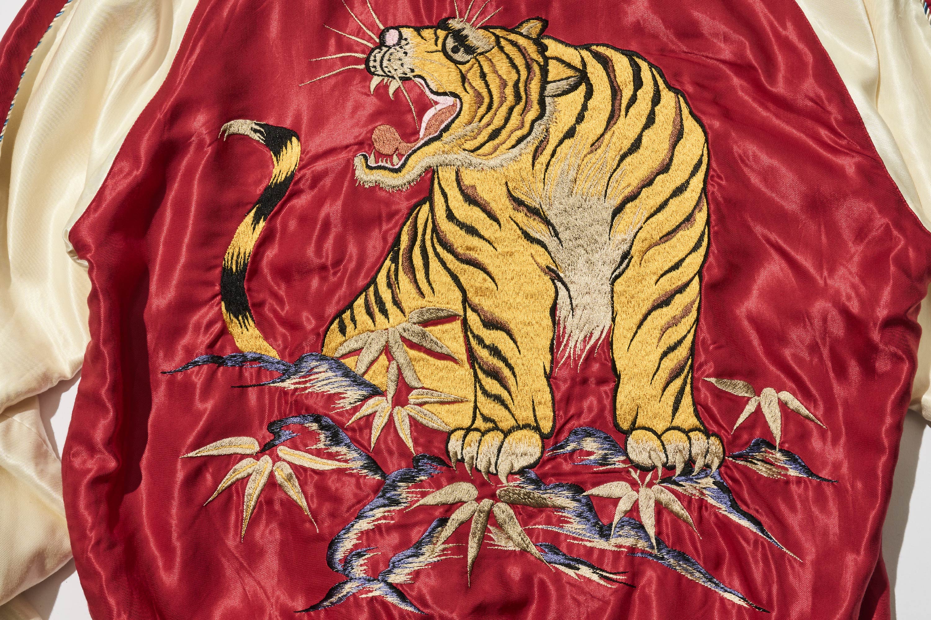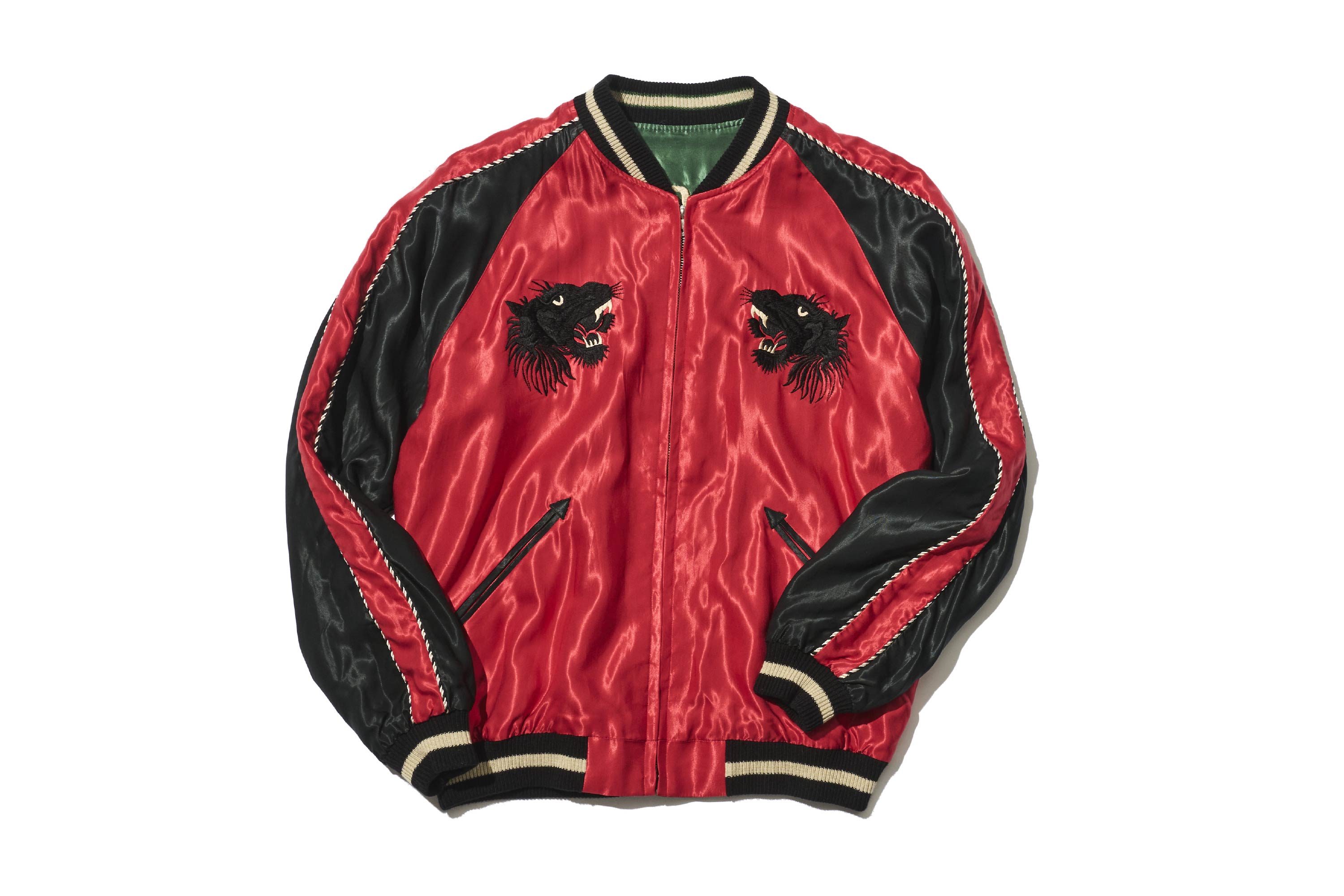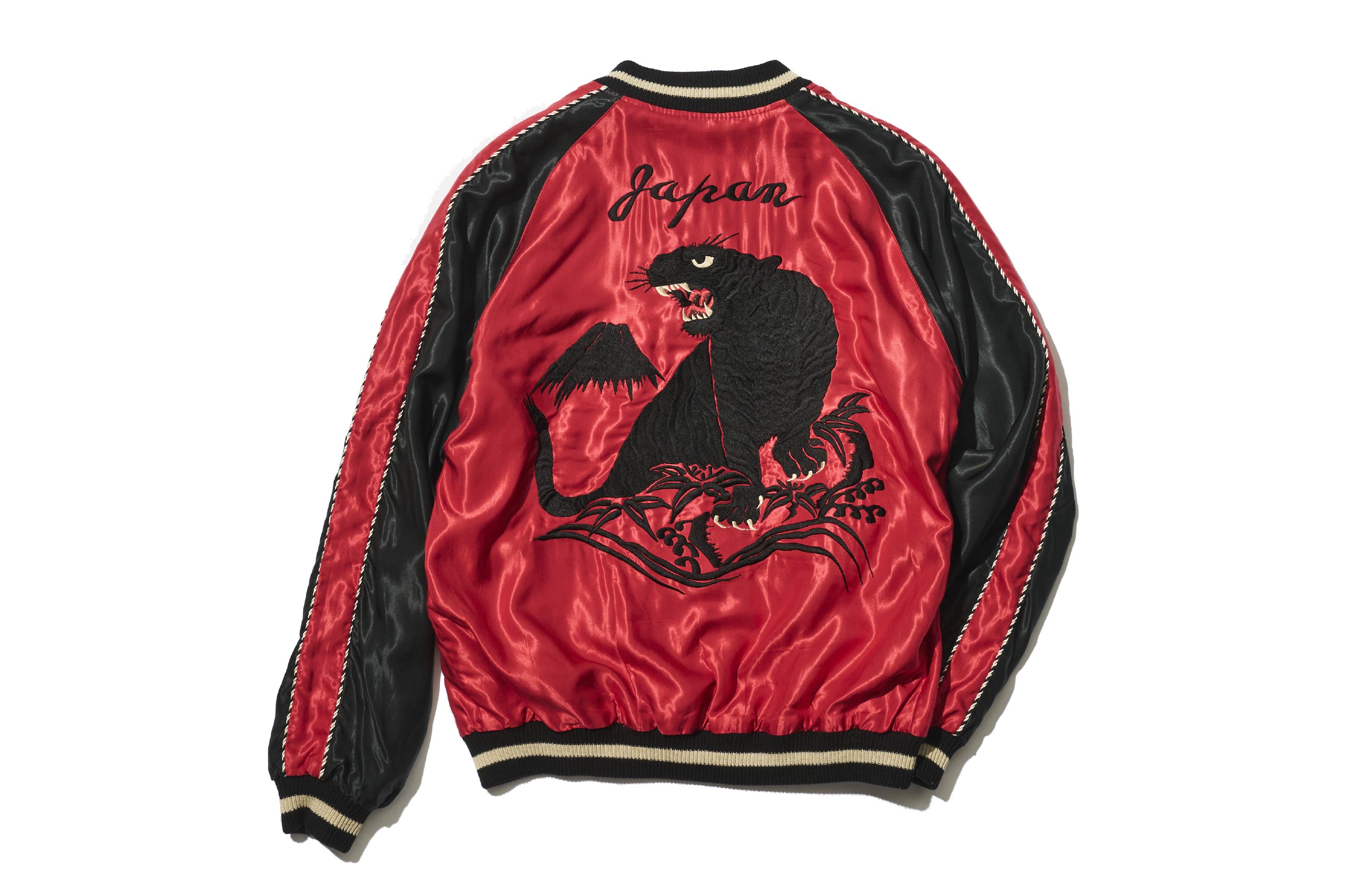 此外,這款外套將繡有龍的這一面翻過來後,會出現漆黑老虎的身影。衣身顏色也從綠色一變,轉為充滿能量感的紅色。為了強調這種鮮明的對比,不只是老虎,連富士山等其他圖案也統一以黑色呈現。