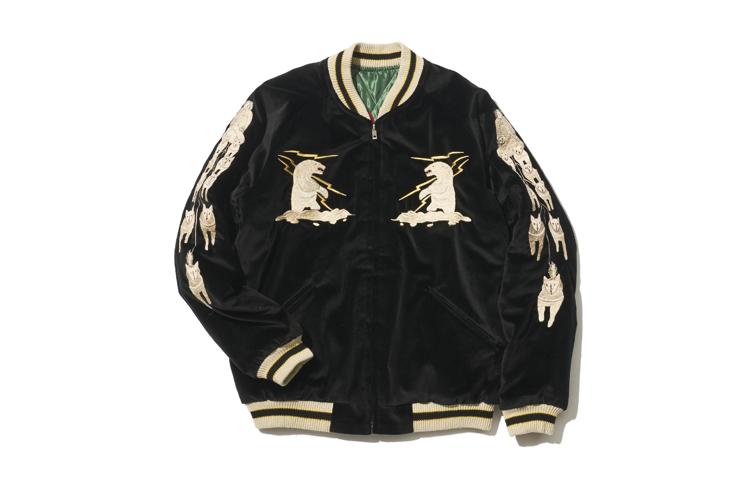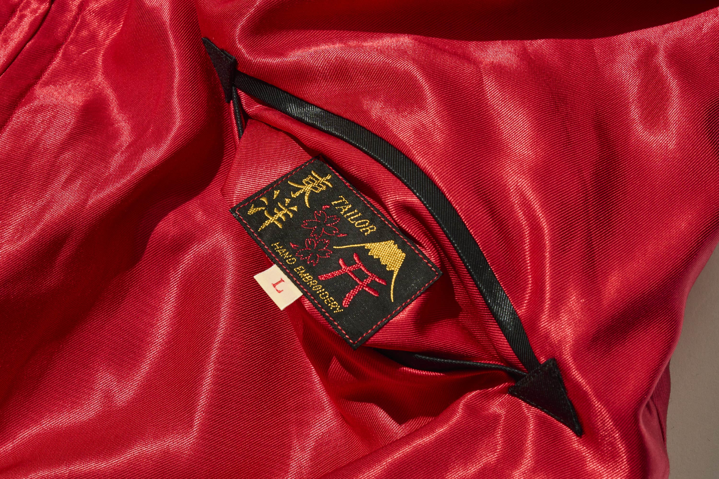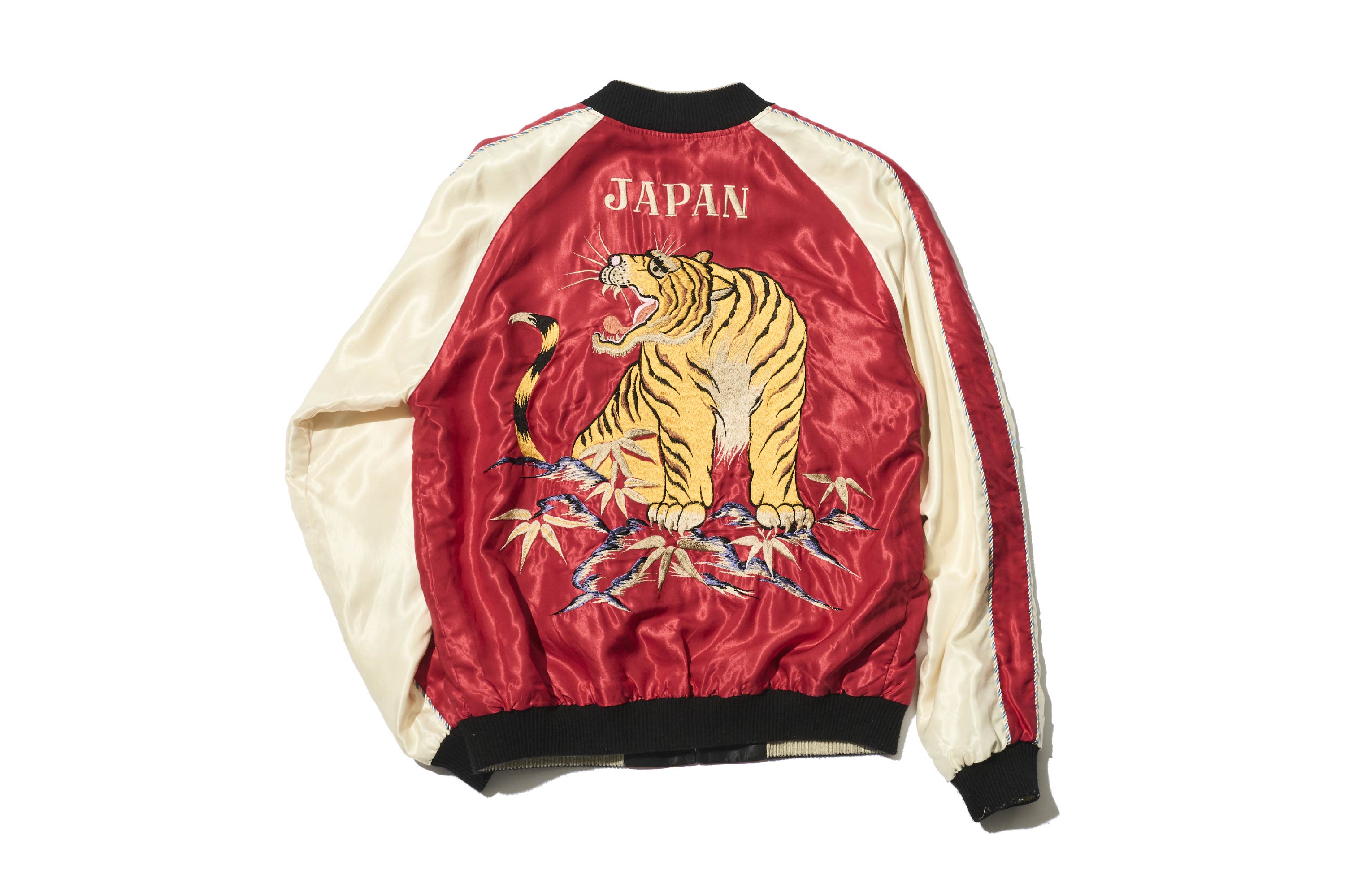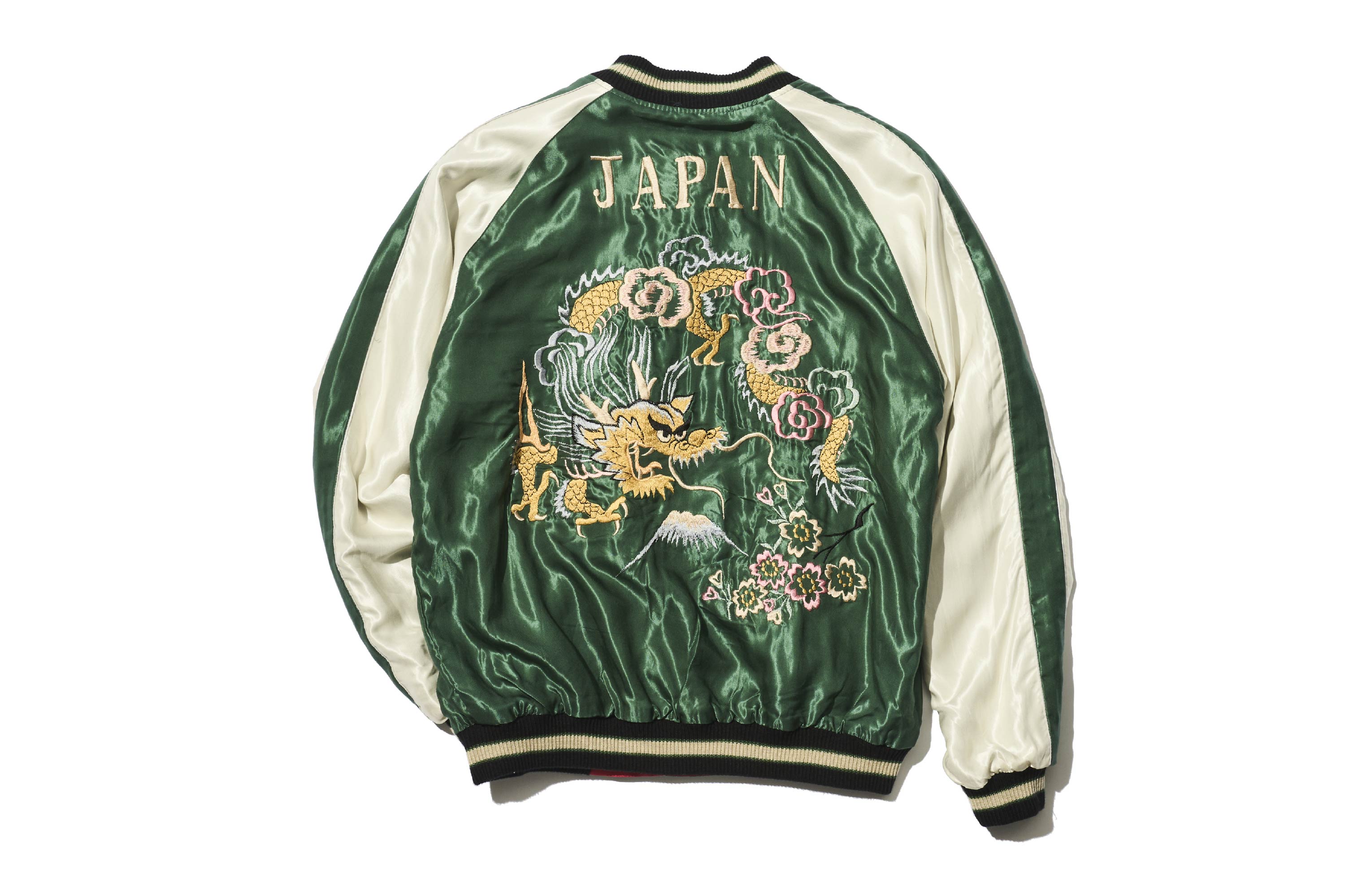 此外,這款外套將繡有龍的這一面翻過來後,會出現漆黑老虎的身影。衣身顏色也從綠色一變,轉為充滿能量感的紅色。為了強調這種鮮明的對比,不只是老虎,連富士山等其他圖案也統一以黑色呈現。