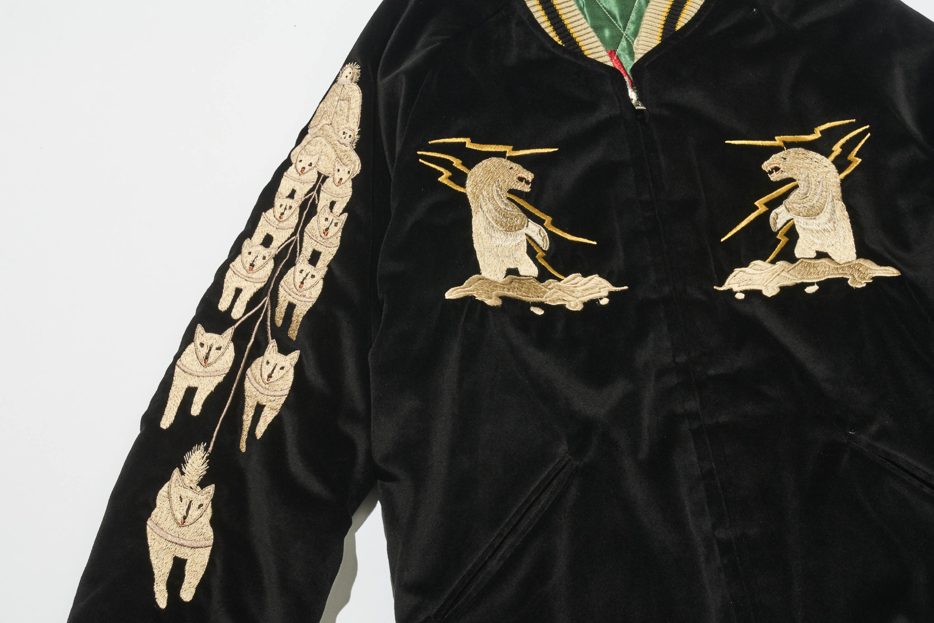 照片中的款式,胸口繡有閃電與白熊,袖子上則是雪地中作為主要移動手段的狗拉雪橇圖騰,取代了常見的線條裝飾。在材質選擇上,並非採用常見的人造絲,而是選用天鵝絨。考量到阿拉斯加嚴酷的寒冷環境,使用了厚實的布料,不僅手感柔軟也帶有高級的光澤,展現出獨特的魅力。
