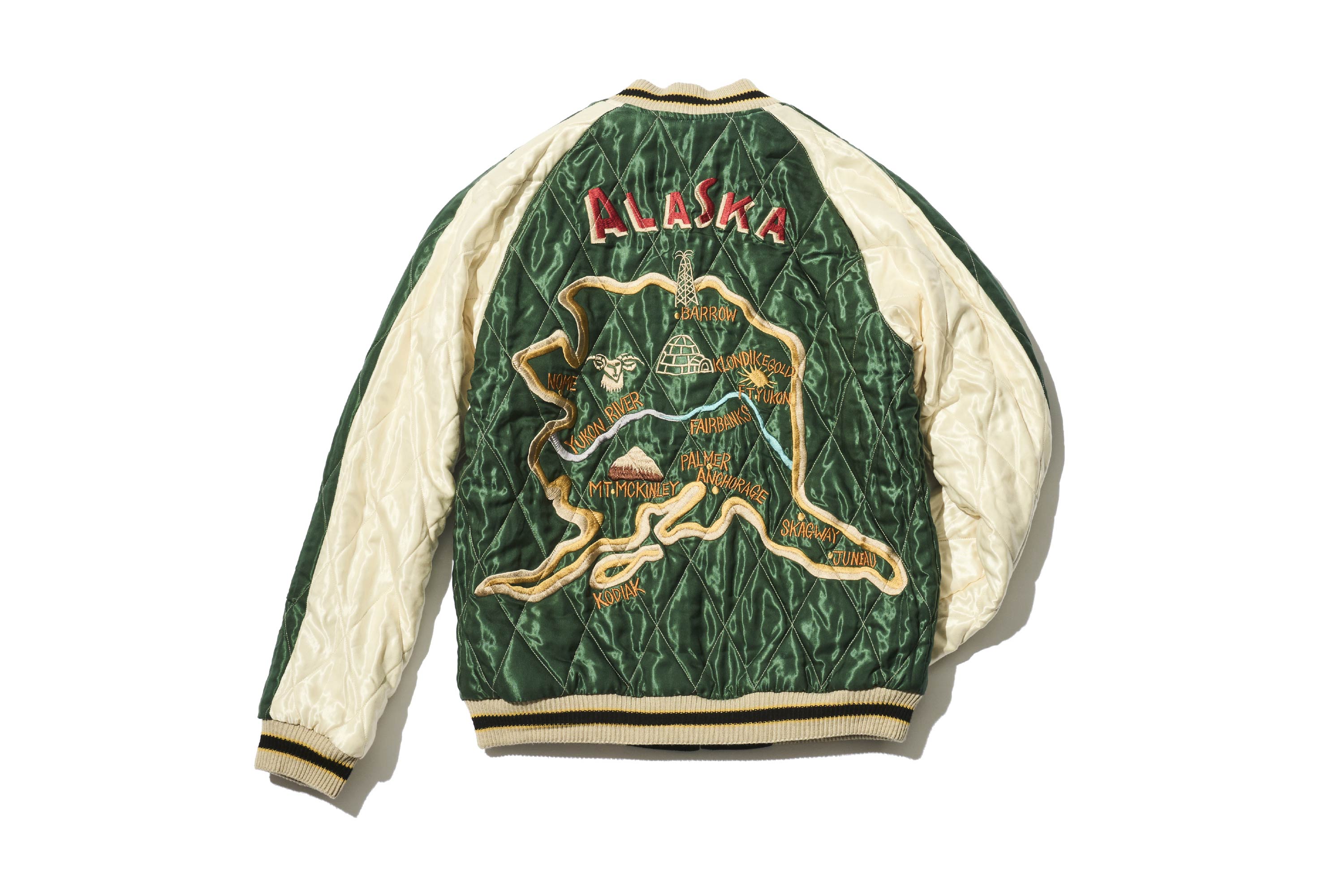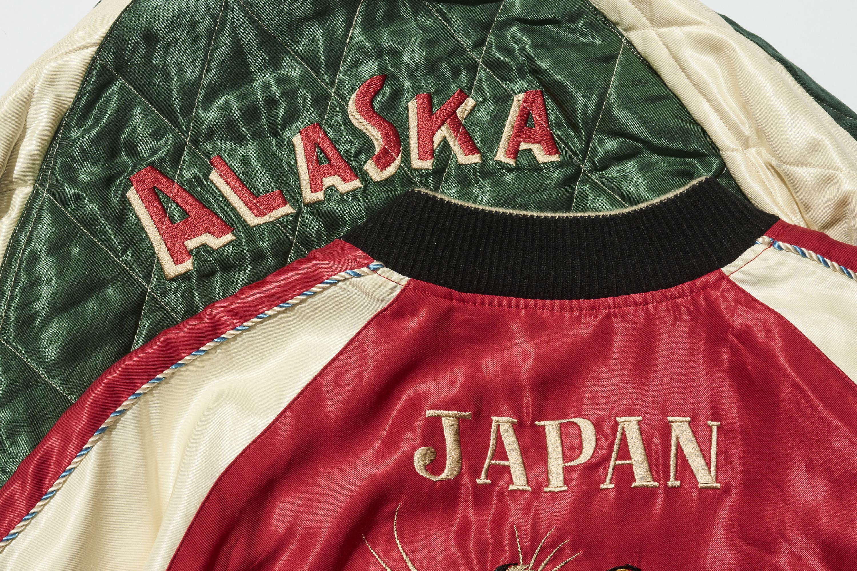 如前面所敘述,誕生於銀座、在橫須賀被賦予名稱,並遠銷至世界各地美軍基地的橫須賀外套,在這樣的發展脈絡下,也經常因應各地美軍基地的請求而製作新圖騰。其中的代表例之一,正是這款「阿拉斯加夾克(アラスカジャン)」。