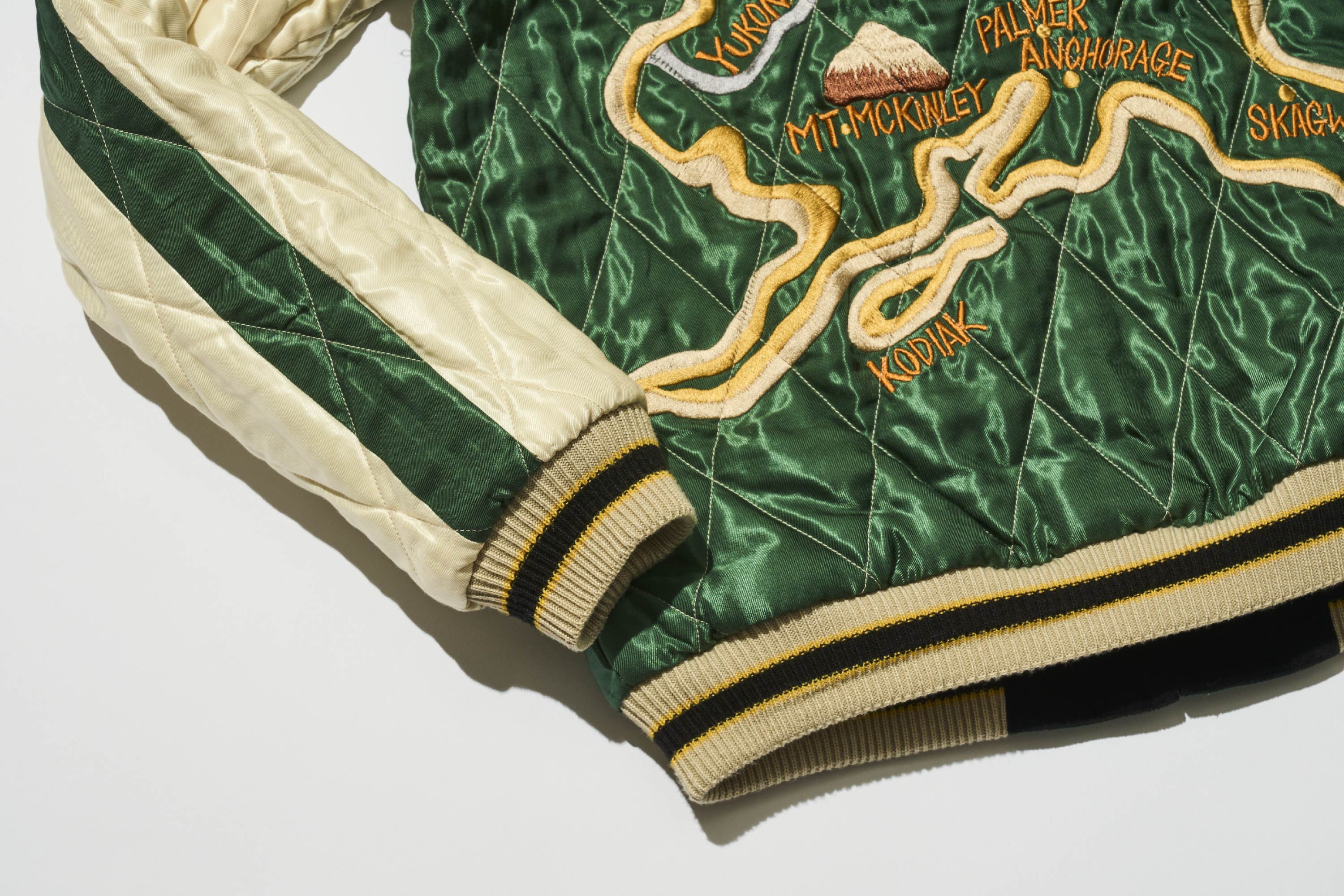 即使翻面後,與阿拉斯加相關的經典圖案依然躍然眼前。胸前兩側同樣由閃電與白熊坐鎮,但背面換成了當地的地圖。再加上袖子是有橫須賀外套特色的拼接線條設計,讓正反兩面的整體風格產生鮮明轉變,透過色彩與設計巧妙的區分,華麗地展現出兩種截然不同的阿拉斯加風情。