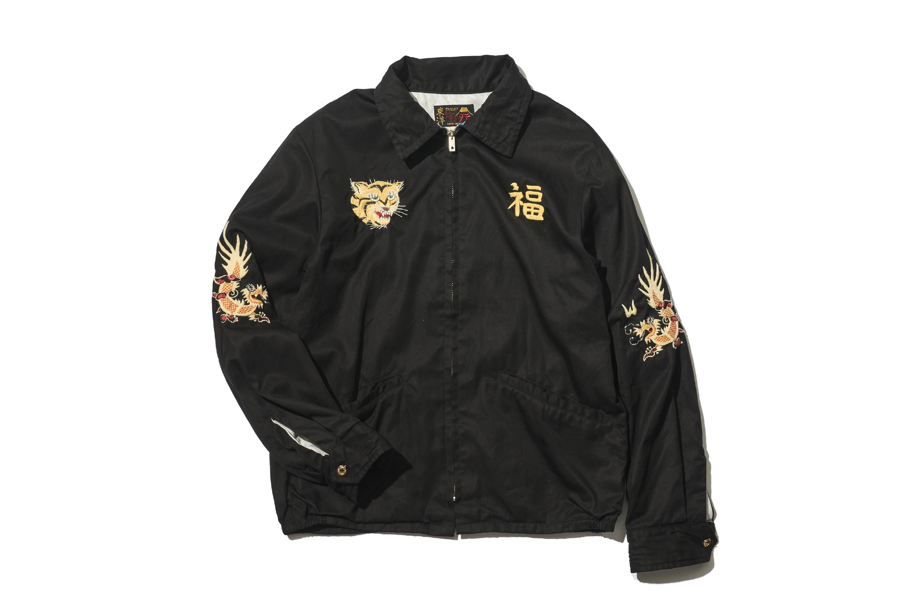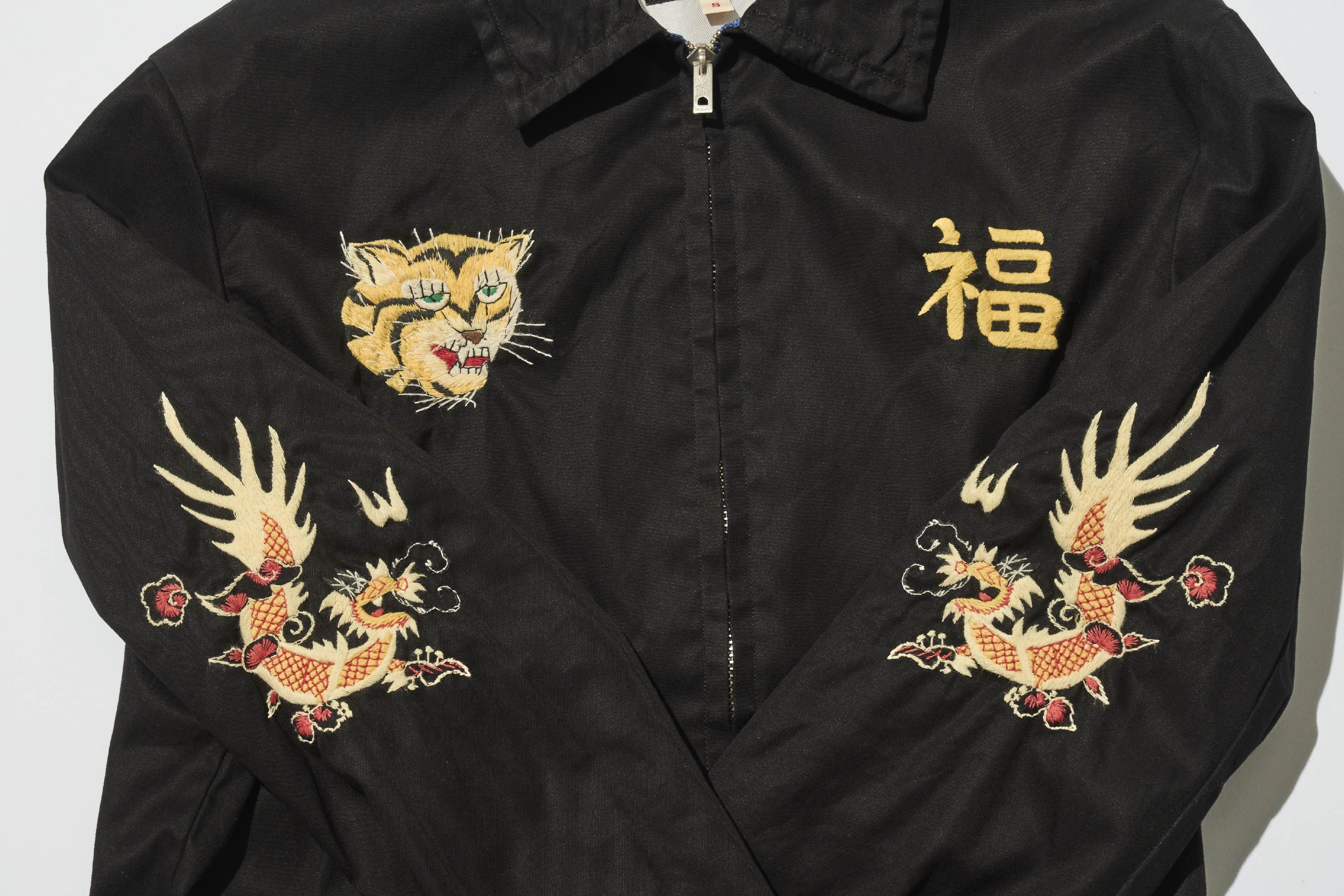 照片中的越戰夾克,是忠實再現當時客製化的款式。除了胸前的虎與龍之外,還可以看到漢字「福」的刺繡。這正是越戰夾克的指標性圖案。取自七福神之一的福祿壽,代表吉祥與好運。