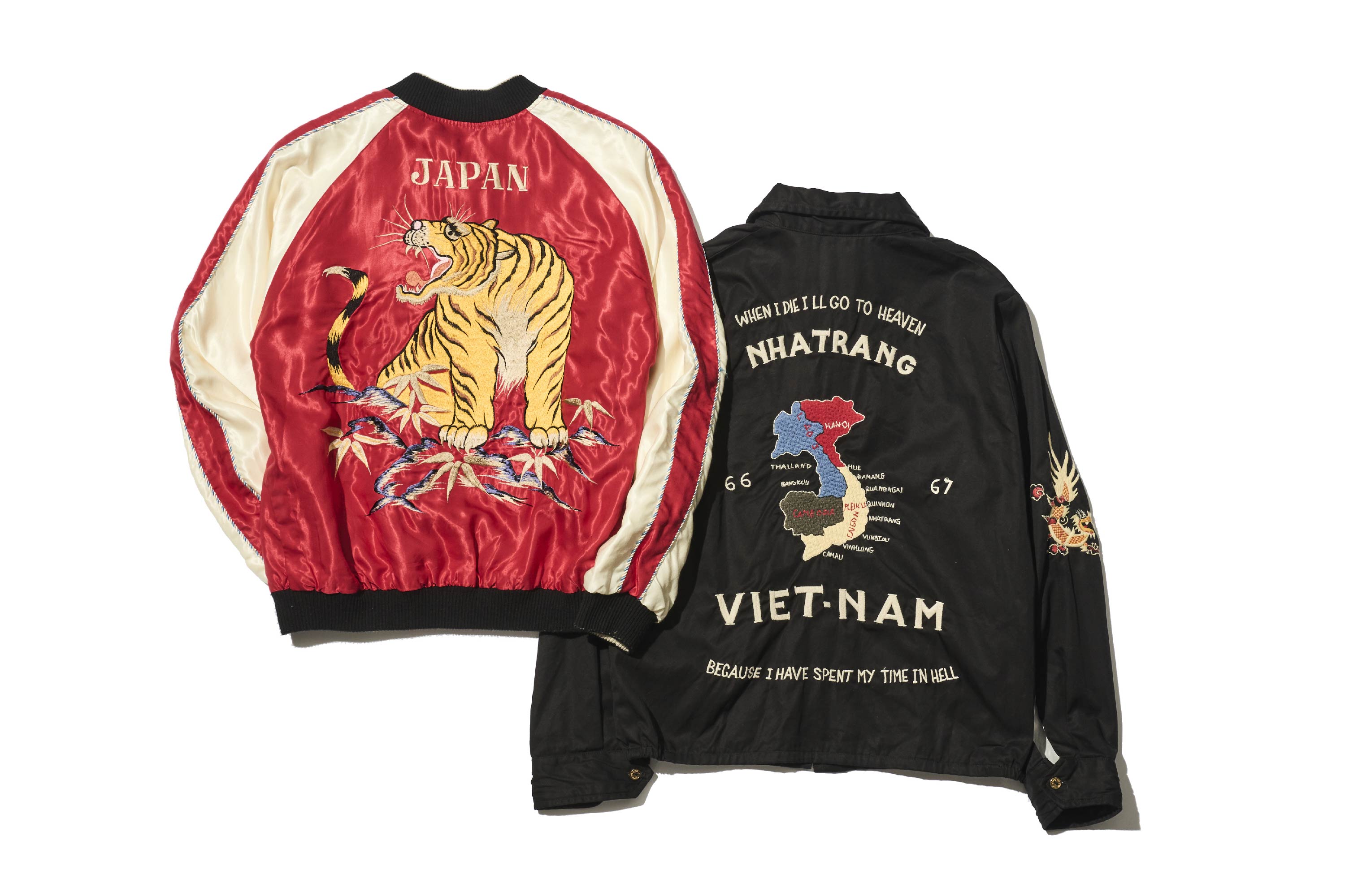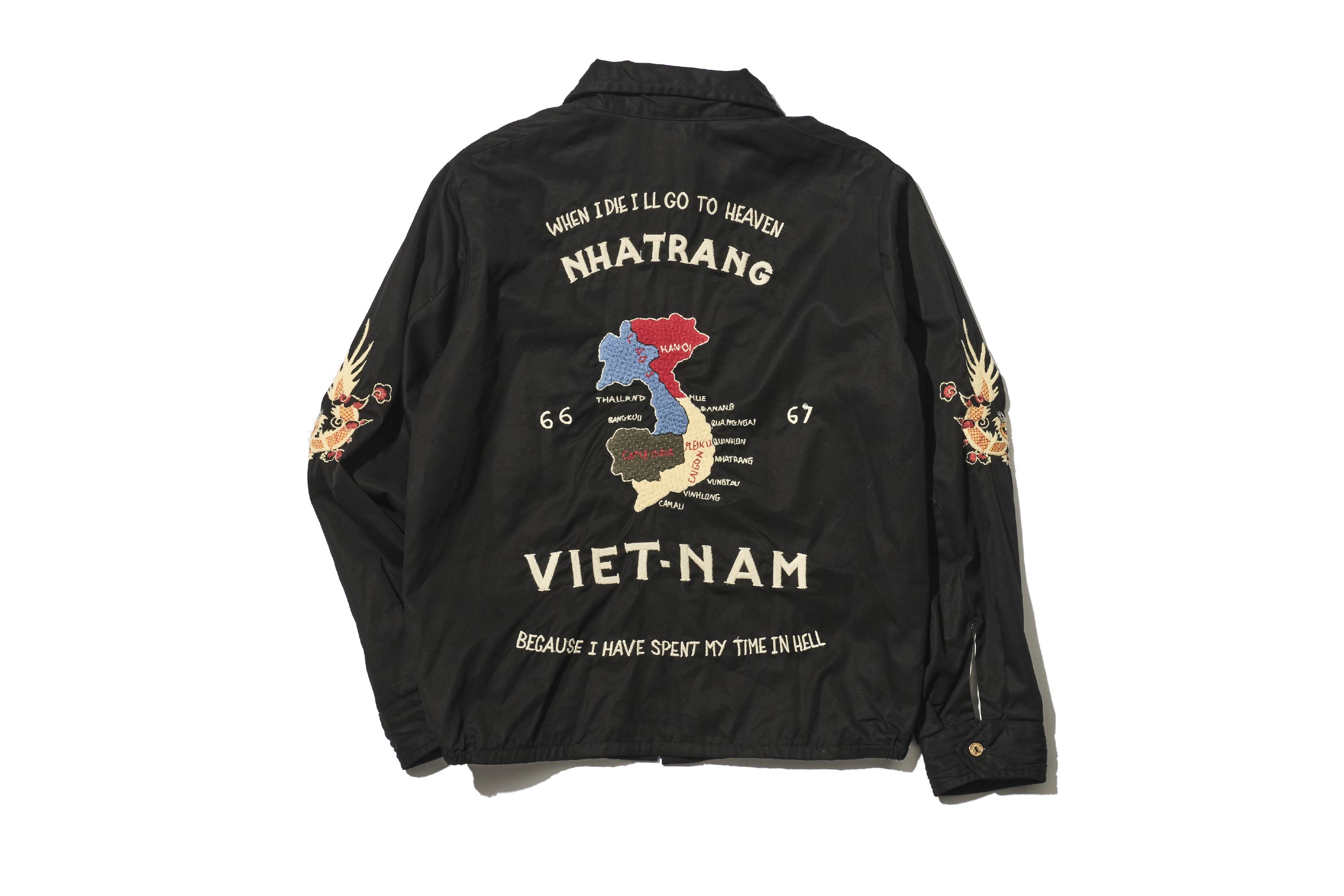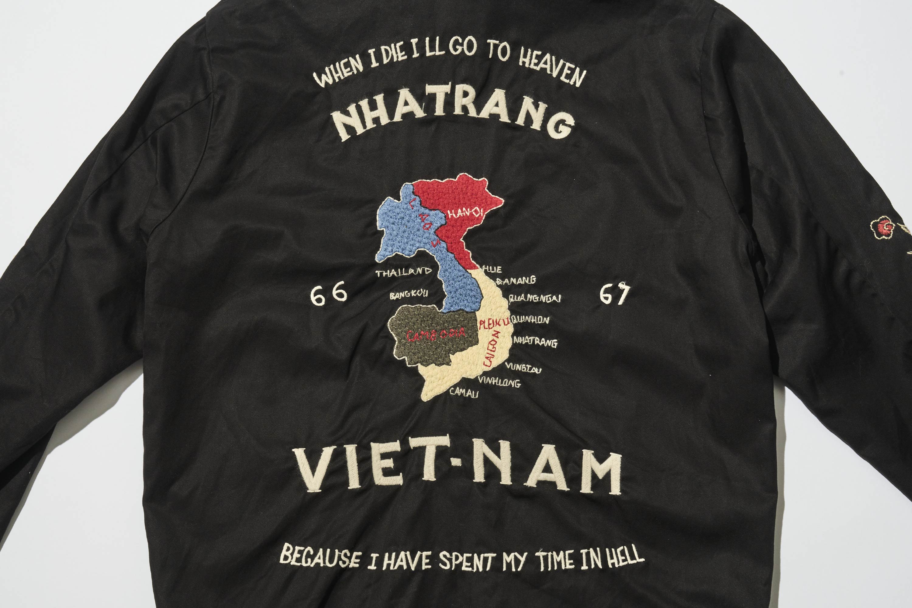 背面繡有越南地圖,最上方寫著「WHEN I DIE I’LL GO TO HEAVEN」,最下方則寫著「BECAUSE I’VE SERVED MY TIME IN HELL」。據說這是當時士兵之間流傳的口號。直譯為:「當我死去時,我將前往天堂」「因為我已經在地獄中服完了我的時間」這是一段極為直白的文字,訴說著戰爭的殘酷與無奈。