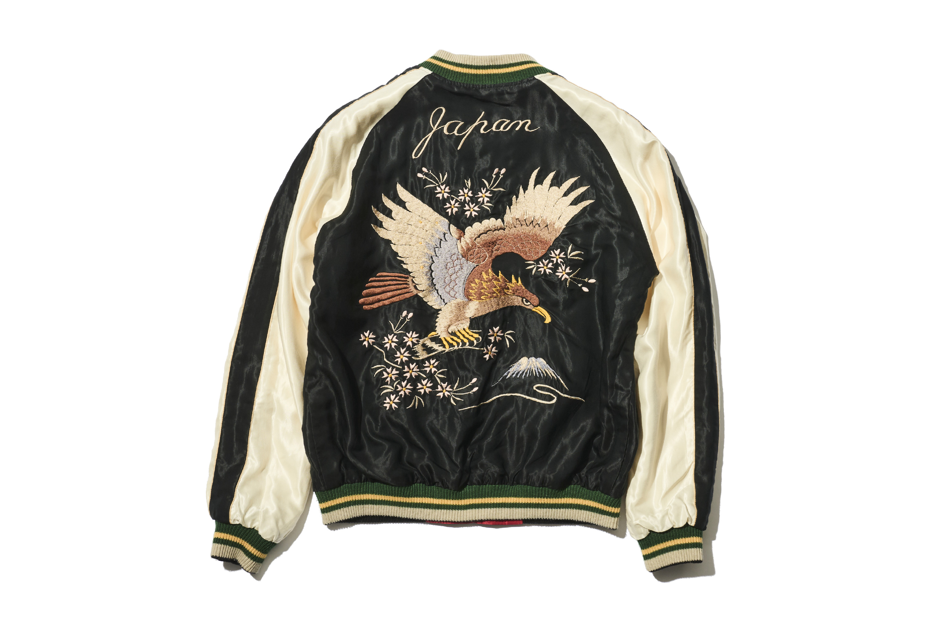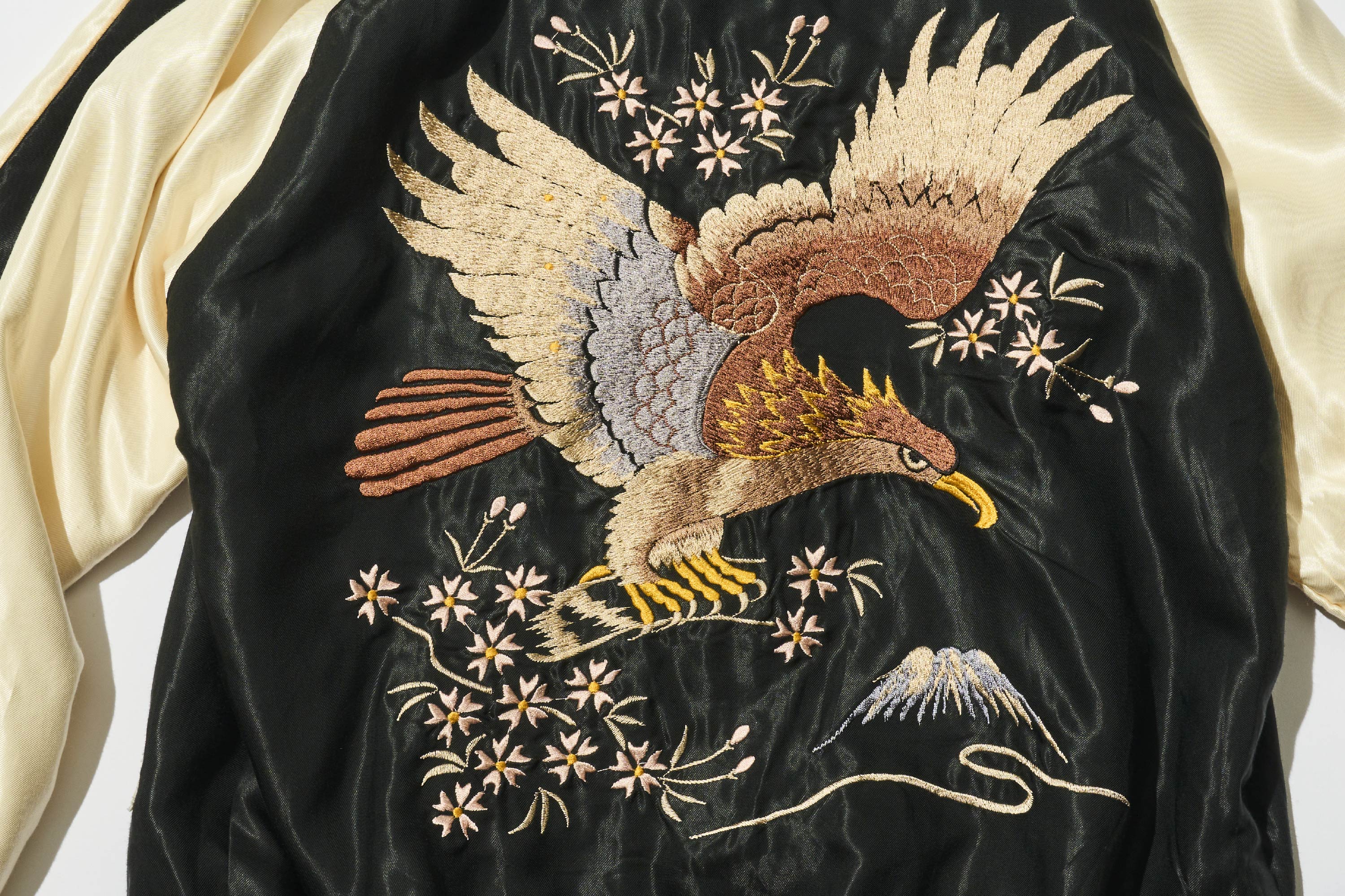 在黑色的緞面布料背後,老鷹刺繡大膽地盤旋飛舞。這正是橫須賀外套教科書等級、層次分明的設計典範。